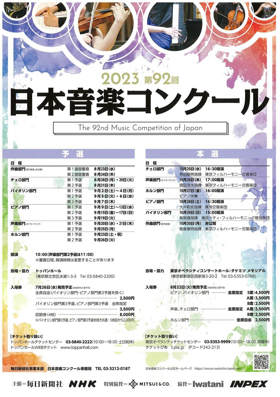| ติดต่อเรา | [チケットのお申し込み] トッパンホールチケットセンター 03-5840-2222(平日10:00~18:00) [日本音楽コンクールに関するお問い合わせ] ■毎日新聞社事業本部内 日本音楽コンクール事務局 03-3212-0187(平日10:00~18:00) ■予選開催日事務局 080-8469-7612 |