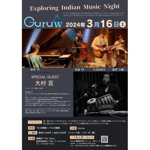 〜リーダーOZIMAが毎年インドに訪れるなかで生まれたフュージョンバンドGuruwが、インドに10年以上タブラを学びに行っている大村亘をゲストに迎えてお送りするスペシャルライブ〜