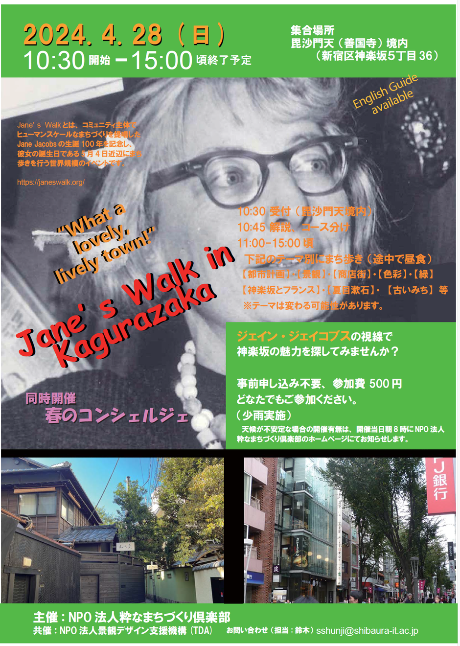 Janeの誕生日が5月4日であるため、このイベントは、世界の諸都市でその周辺の日程で実施することになっています。今年2024年は主催:NPO粋なまちづくり倶楽部、共催:NPO景観支援機構(TDA)で、4月28日(日)に実施いたします。神楽坂のまちをさまざまな視点から改めて見直しながら歩きます。多くの皆様のご参加をお待ちしております。