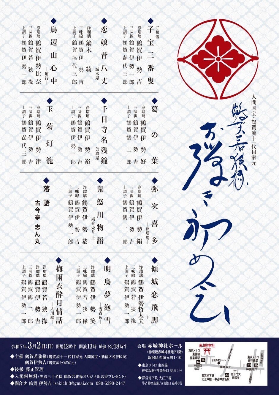 その鶴賀流による発表会「鶴賀流お弾き初め」が開催されます。今回は、人間国宝・鶴賀若狭掾の新内に加え、古今亭志ん丸の落語も楽しめます。入場無料なので、ぜひ足をお運びください。