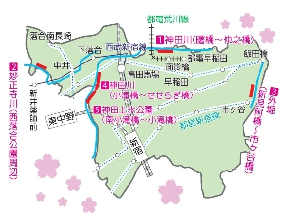 | สถานที่ | [1]神田川、[2]妙正寺川、[3]外濠、[4]神田川、[5]神田上水公園 |