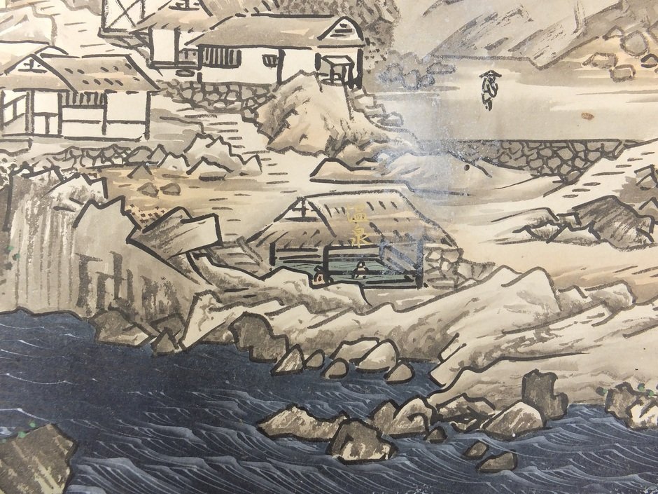 画面をくまなく見てみると、松明を手に洞窟を探検する一行の姿、温泉につかり体を癒す人々など、本作にはごく小さく人物が描きこまれていることがわかります。大自然のなかを取材する絵師たちの姿と重なり、見る者を画巻の世界へ誘います。