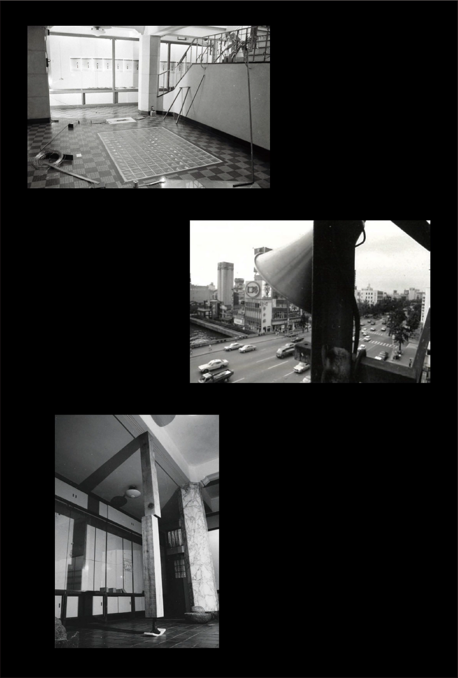 上|河口龍夫《関係ー電流》1972年–、中|今井祝雄《この偶然の共同行為を一つの事件として……》1972年(今井祝雄×倉貫徹×村岡三郎)撮影:夏谷英雄、下|植松奎二《截接ーCutting》1971/1975年