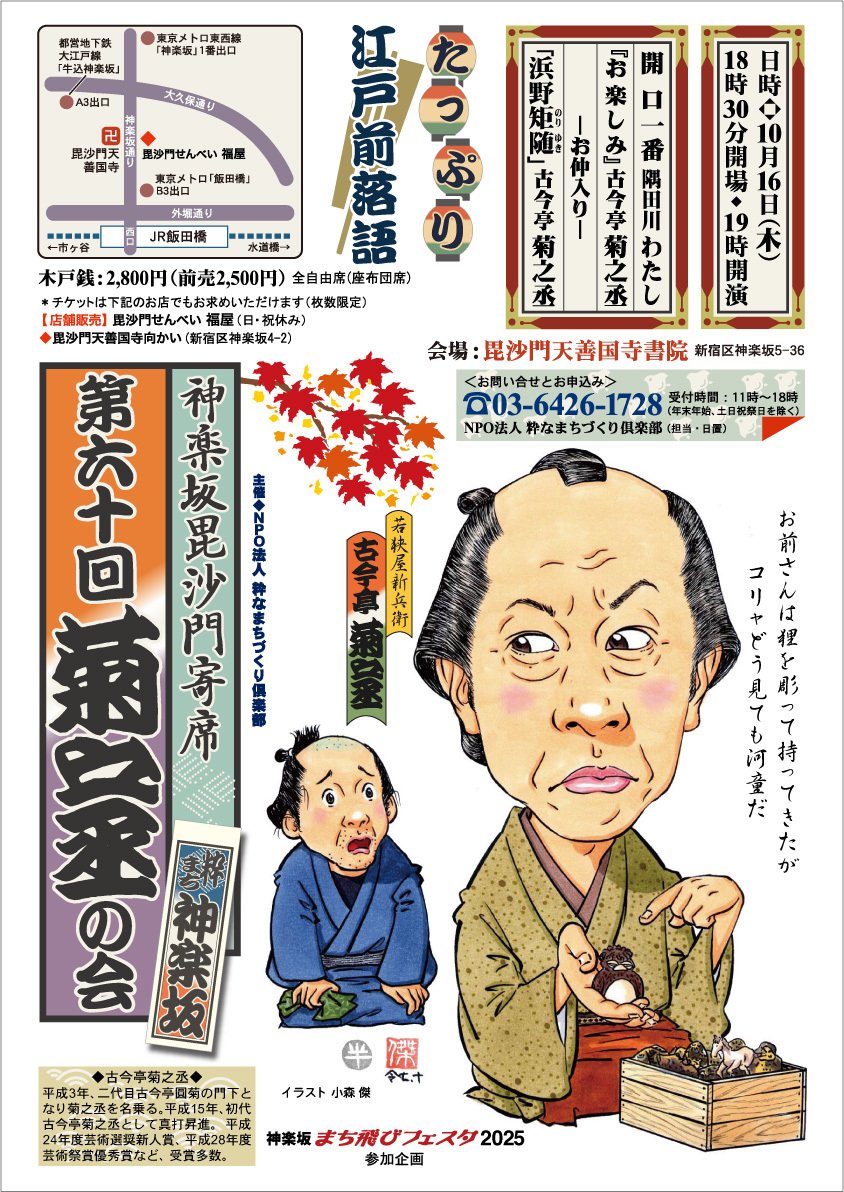 | สถานที่ | 神楽坂 毘沙門天 善国寺書院 (神楽坂5-36) JR飯田橋駅、西口 徒歩10分 有楽町線飯田橋駅 B3出口 徒歩5分 東西線神楽坂駅(神楽坂口) 徒歩7分 大江戸線牛込神楽坂駅 A3出口 徒歩6分 |