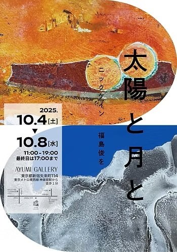 2013年に出会い、2016年には広島で初の二人展を開催。異なる文化に育った二人が影響し合いながら制作を続けてきました。今回のテーマ「太陽と月」は、互いに光と影を与え合う存在としての関係性を表現しています。ニック・ケインはアクリルインクレジストによる風景画や静物画、福島俊はガラス絵と墨画を出展します。