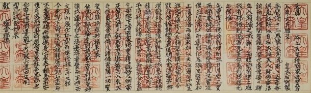 今回展示する『東大寺献物帳』書写本は、長年にわたり東京国立博物館で大仏蓮弁刻画や正倉院宝物研究を担われ、また本学第一文学部や日本女子大学でも教鞭をとられた奥村秀雄氏によって書写されたものです。用紙の選定、天皇御璽の模刻押印、表装の仕立てにいたるまで、原本にできるだけ忠実に制作された全巻の書写本は稀であり、原本が一般に公開される機会がほとんどない中で、貴重な存在といえるでしょう。