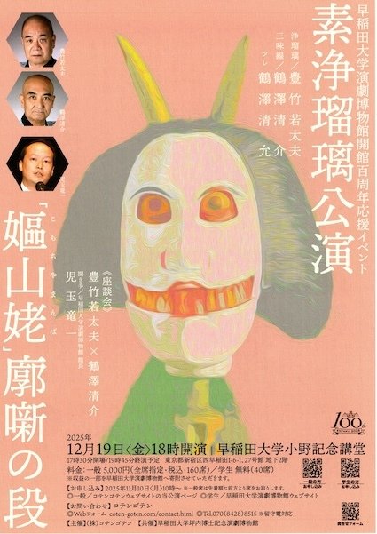 演劇博物館は2028年に開館100周年を迎えます。このたび株式会社コテンゴテン主催による、演劇博物館開館100周年応援イベントと題した素浄瑠璃・寄付公演が行われます。