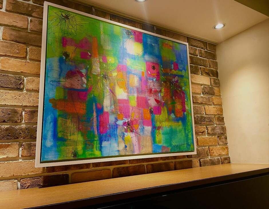 ピアノ左横レンガ壁:アクリル画「宇宙」「ベア」「薔薇」Sayuri Kobayashi、