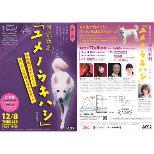 朗読と音楽の融合を目指して、積極的な活動を展開している朗読歌劇そらのおと。師走のほっこりしたひとときをとお届けする新作書き下ろし「ユメノウキハシ」。怪我をした白犬を助けたのに、次から次へと僕に不幸が降りかかってくるのは何故?。――落語『元犬』に発想を得て、朗読歌劇の新たな境地をお届けします。前半には、これまでの朗読歌劇の中で生まれた楽曲によるミニコンサートもお楽しみいただきます。