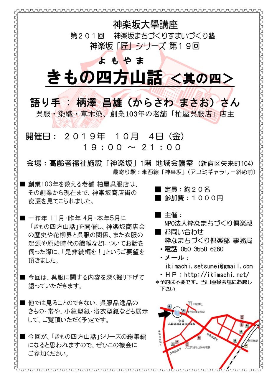 | สถานที่ | 高齢者福祉施設「神楽坂」1階 地域会議室 (新宿区矢来町104) 最寄り駅:東西線「神楽坂」(アユミギャラリー斜め前) |