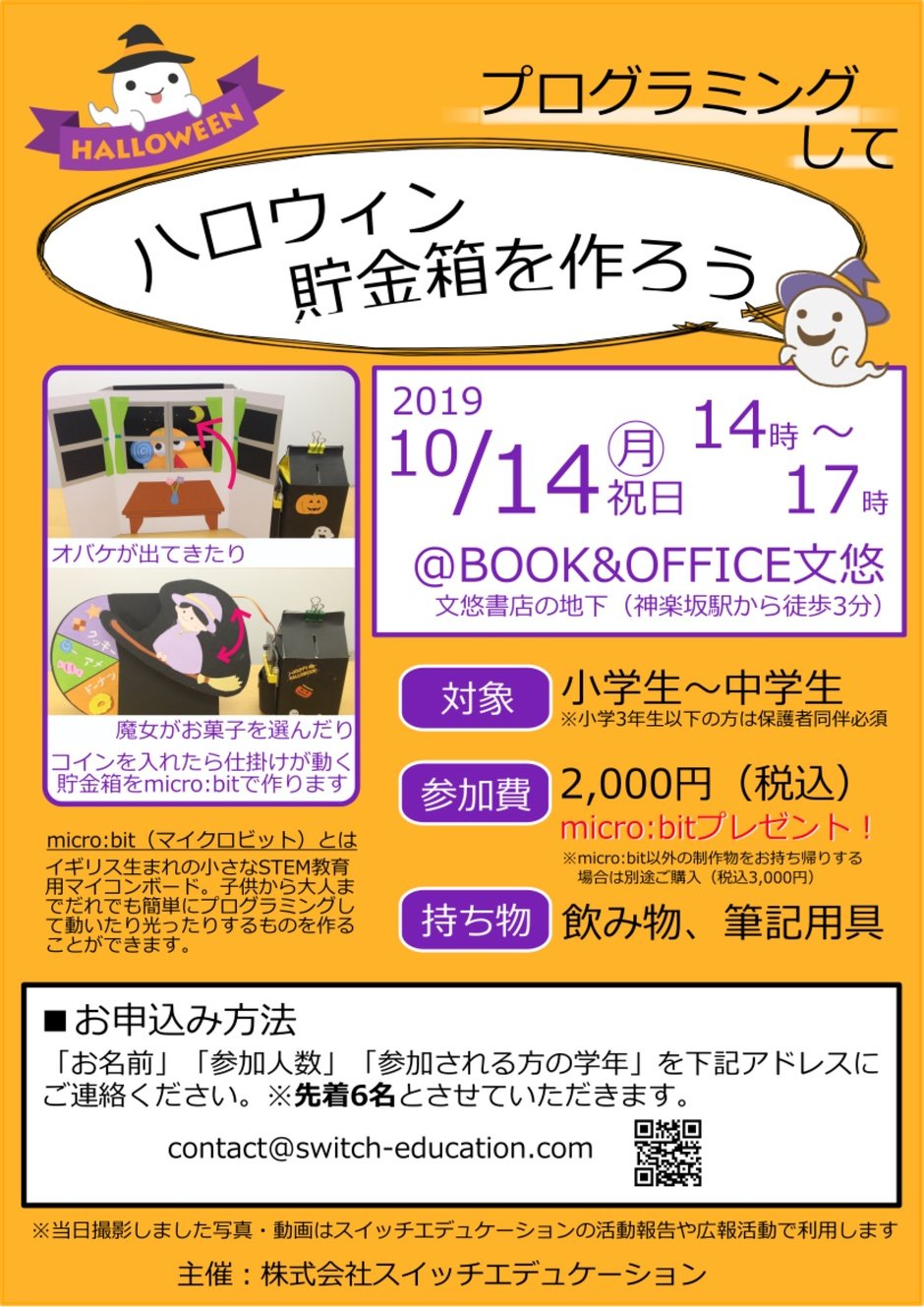 コインを入れたら仕掛け(おばけが出てきたり、魔女がお菓子を選んだり)が動く貯金箱をマイクロビット(プログラミングして物を動かしたり光らせる基盤)で作ります。対象は小学生から中学生です。小学3年生以下のお子さんは、保護者の方がご一緒に参加お願いいたします。主催はスイッチエデュケーションさんです。
