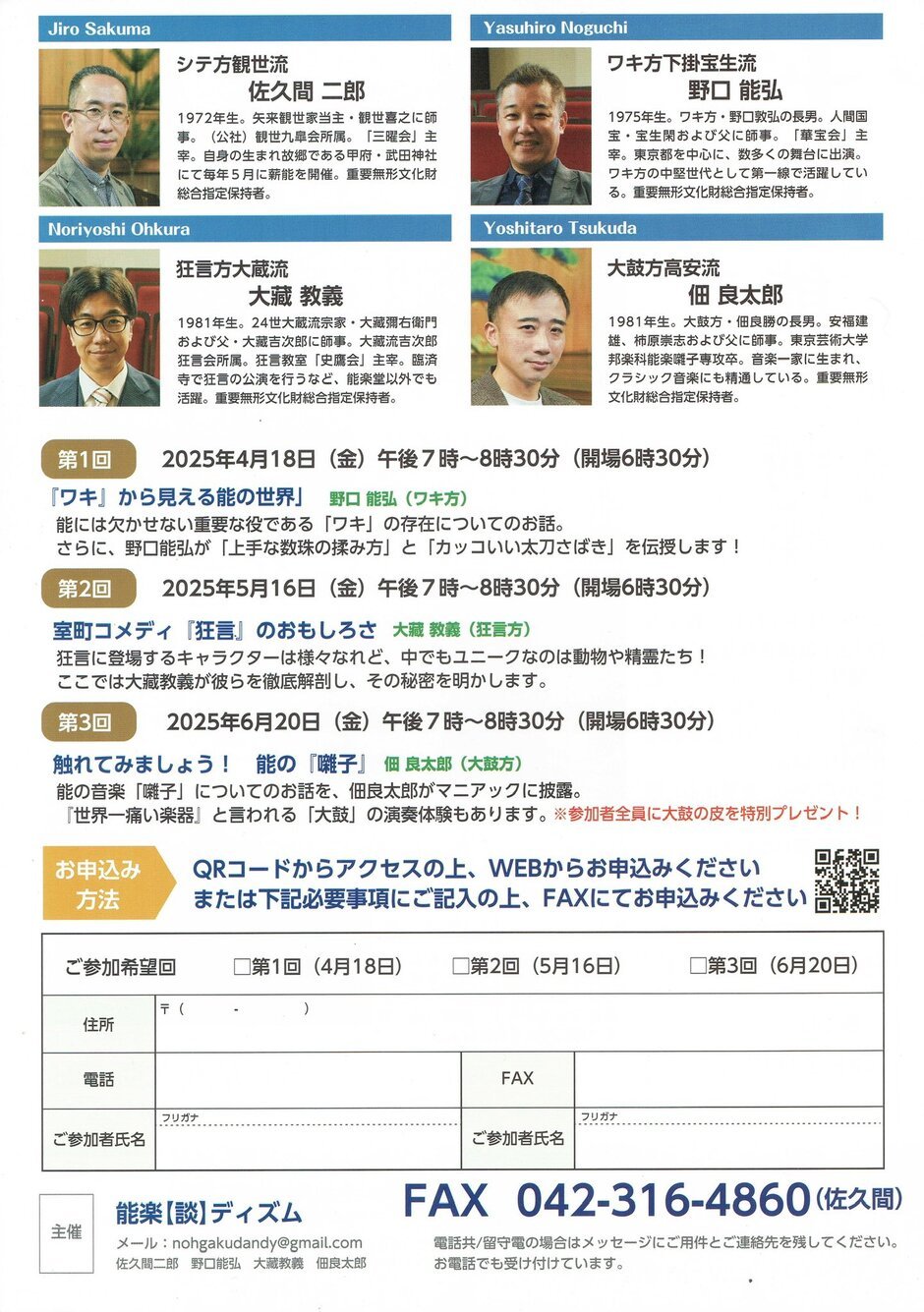 シテ・ワキ・狂言・囃子方の4名で結成されたユニット「能楽【談】ディズム」による、どこよりもスペシャルでマニアックな能楽講座がついに開催。