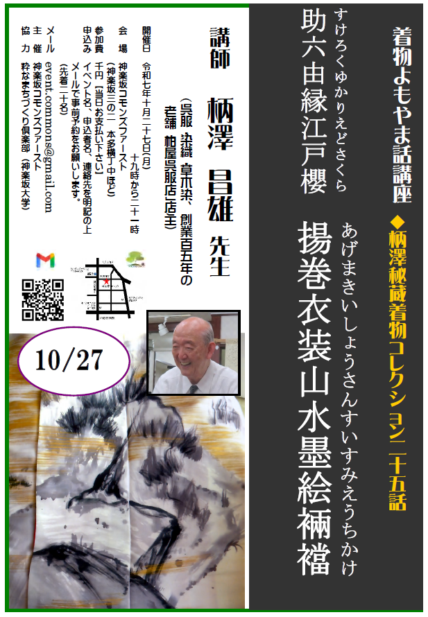 神楽坂コモンズファースト主催・粋なまちづくり倶楽部協力の、着物・染め物よもやま話「柄澤昌雄コレクション第25話」のお誘いです。