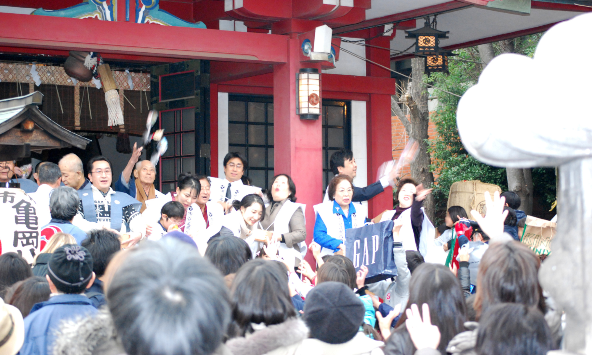 ペットと一緒にお参りができる神社としても有名な市谷亀岡八幡宮では、今年も干支にあたる善男善女が、境内で盛大に豆まきを行ないます。「皆様の一年が健やかで幸多きものとなり、心穏やかな日々を過ごされますよう、心よりお祈り申し上げます。」と、梶 謙治宮司よりお言葉をいただきました。豆まきでは恒例の福袋も10名の方に当たりますので、災厄を祓って福を授かってください。